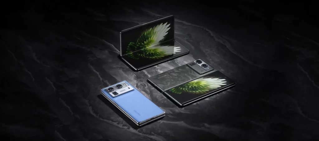 The Fold 2 is powered by a MediaTek Dimensity 9000+ processor, 12GB of RAM (expandable), and 512GB of storage. The rear camera setup includes a 50MP main sensor, a 50MP portrait lens with zoom, and a 50MP ultra-wide lens. It also features dual front-facing cameras.