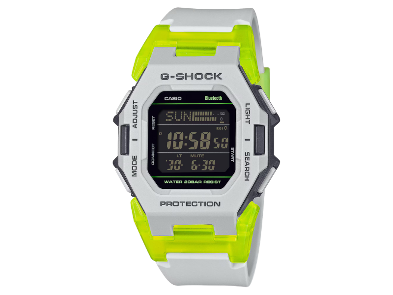 The flagship GA-B001MW-8AJF showcases a Carbon Core Guard with resin casing, featuring a hybrid analog-digital display with luminous green hour markers. Moving away from traditional G-Shock bulkiness, the watch presents a notably slimmer, more angular profile suited for urban wear. It includes Bluetooth connectivity for smartphone pairing, enabling features like automatic time adjustment, and phone-finding capabilities. Battery life extends to two years, supported by power-saving features and low-battery alerts.
