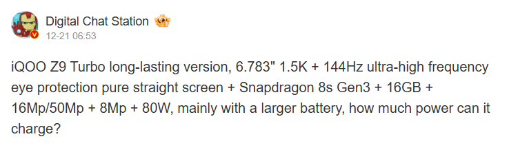iQOO is preparing to release a new version of its Z9 Turbo smartphone, called the “Endurance Edition.” According to leaker Digital Chat Station, this variant will feature an upgraded battery, although the exact capacity has not been confirmed.