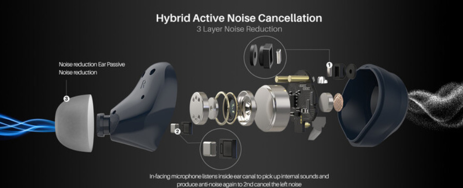 Then, inward-facing microphones listen inside the ear canal to pick up internal sounds and produce anti-noise again to cancel the left noise twice. Last but not least, Tozo claims the bud’s ear caps block up to 90% of external sound.