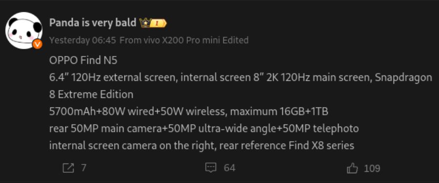 Recent whispers from Oppo’s Find Product Manager, Zhou Yibao, on Weibo shed some light on the launch timeline for the Find N5. Now, a new leak on Weibo by a tipster has spilled the beans on the alleged specifications of the Oppo Find N5 foldable phone.