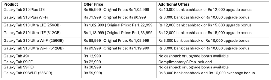 For budget-conscious buyers, the Galaxy Tab A9+ starts at an attractive Rs 12,999, while the Galaxy Tab S9 FE offers premium features, including an S Pen, at Rs 22,999. For users seeking enhanced performance, the Galaxy Tab S9 FE+ is priced at Rs 30,999. Additionally, the Galaxy Tab S9 Wi-Fi (256GB) is available at Rs 59,999, with benefits like Rs 9,000 cashback and a Rs 3,000 exchange bonus.