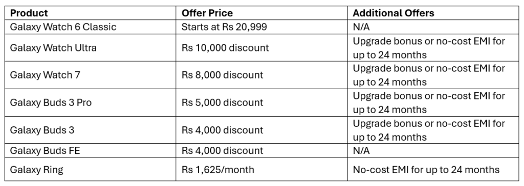 Samsung’s wearable lineup is also part of this offer. The Galaxy Watch 6 Classic, known for its rotating bezel and comprehensive health features, starts at Rs 20,999. The Galaxy Watch Ultra, designed for fitness enthusiasts, is available with a Rs 10,000 cashback or upgrade bonus.