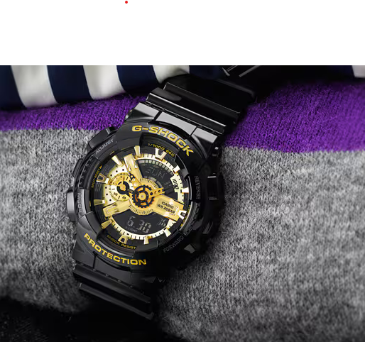 For those who prefer the iconic G-Shock look, we have the Casio Baby-G BA110-1A watch. One of its variants even includes the full black body with golden accents on the dial and hands. This model is clearly inspired by the GA110 G-Shock big case series but in a smaller form factor.