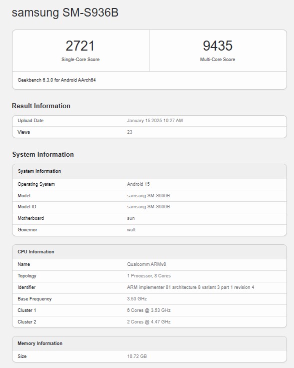 The Galaxy S25 Plus, with model number “SM-S936B,” appeared again on Geekbench, revealing a single-core score of 2721 and a multi-core score of 9435. The CPU configuration includes six cores clocked at 3.53 GHz and two cores at 4.47 GHz, paired with an Adreno 830 GPU for advanced graphics performance.
