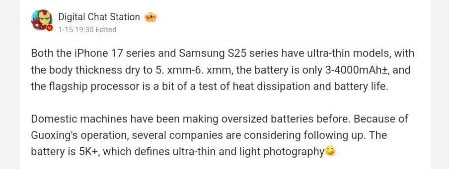 According to renowned Weibo tipster DCS, both devices are rumored to be around 5.x mm to 6.x mm thick, significantly slimmer than their predecessors—the Galaxy S24 and iPhone 16—both of which measure over 7.5mm in thickness.