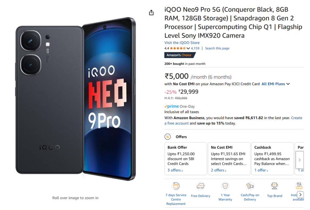 The iQOO Neo 9 Pro 8GB + 128GB model is now priced at ₹29,999 on Amazon India, with an extra ₹1,250 discount for SBI credit card users. Typically retailing at ₹34,999, this offer makes the device highly appealing, especially as the most affordable smartphone featuring the Snapdragon 8 Gen 2 processor.