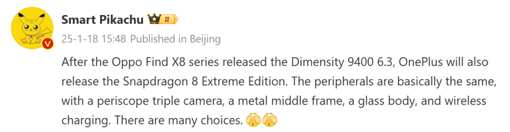 The OnePlus 13 Mini will feature the Snapdragon 8 Elite, while the Find X8 Mini will feature the Dimensity 9400 chip. Smart Pikachu’s leak reveals that the device will also support wireless charging. Unfortunately, there is no information available about its battery size.