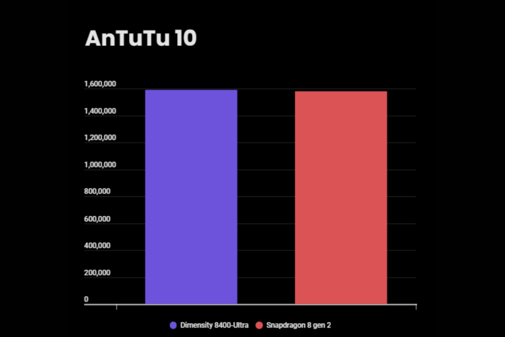 The Dimensity 8400 and Snapdragon 8 Gen 2 have similar AnTuTu scores. Some differences might occur due to software optimizations and heat management.