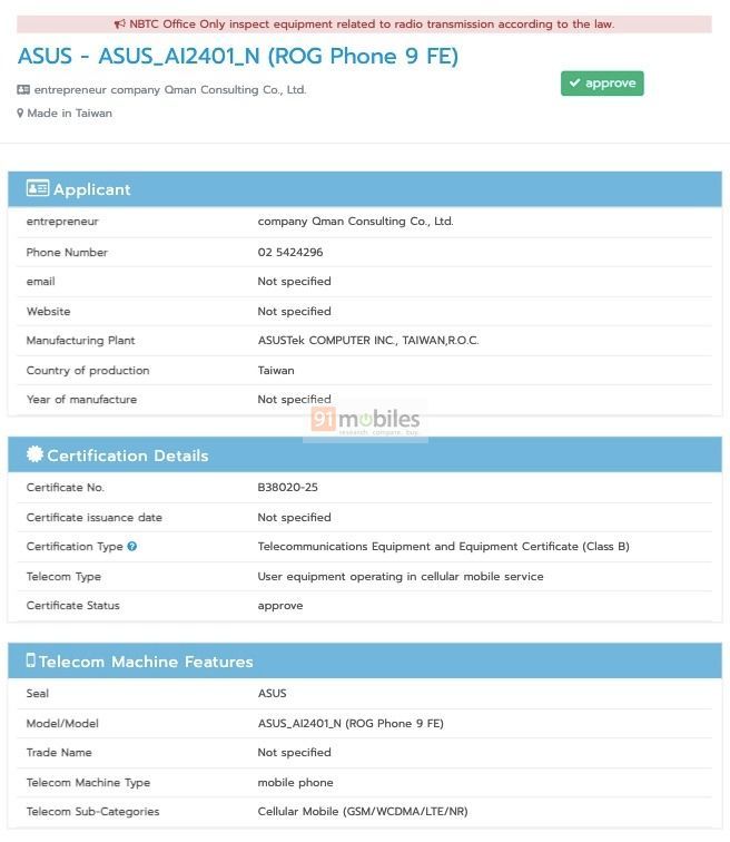 Asus appears to be expanding its ROG Phone 9 series with a new variant, the ROG Phone 9 FE, potentially a more affordable “Fan Edition.” Certifications in Malaysia (SIRIM) and Thailand (NBTC) reveal the model number “ASUS_AI2401_N,” confirming its existence and possible launch in these regions soon. The same model number was previously seen on the GSMA certification site.