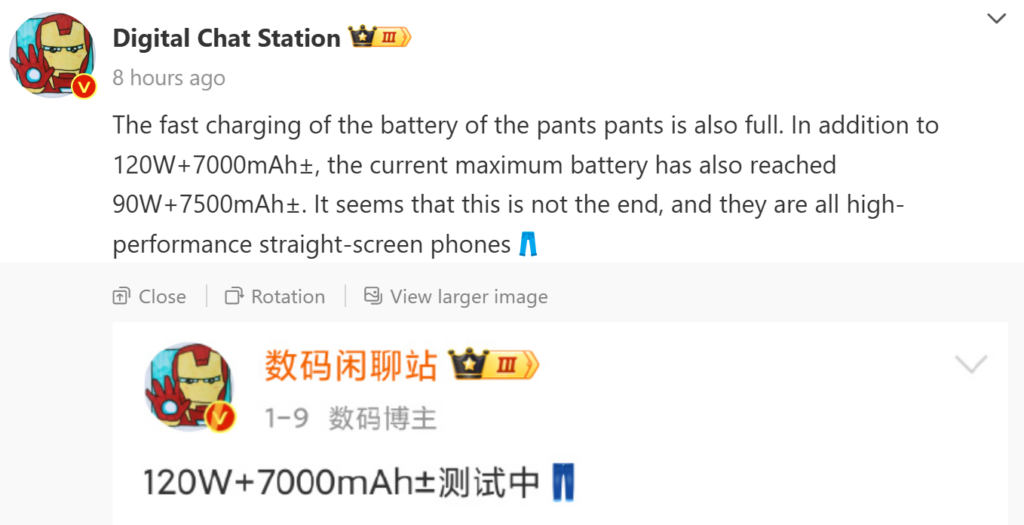 Shown above is DCS’ Weibo post that he released earlier this month, which states that an iQOO phone is being tested with a 7,000mAh battery with 120W fast charging. In the latest Weibo post, iQOO also has a 7,500mAh battery and 90W charging combination for its high-performance phones, which will come equipped with a flat OLED panel.
