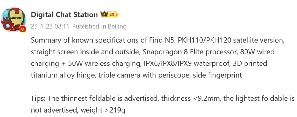 In terms of the design, the Find N5 will have a 3D-printed titanium alloy hinge and offer IPX6, X8, and X9 levels of water resistance. The standard version of the device has the PKH110 model number. It is also said to have a satellite communication version with the PKH120 model number.