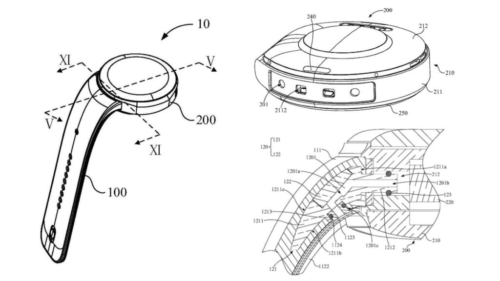 OPPO’s patent eliminates the need for a separate air nozzle by incorporating the air path into the watch strap. The watch head houses an air pump and a shell assembly that connects to the strap via a “connecting assembly.” This connection completes the air path, allowing the pump to inflate and deflate the airbag without a separate nozzle.