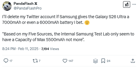 “I’ll delete my Twitter account if Samsung gives the Galaxy S26 Ultra a 7000mAh or even a 6000mAh battery I bet. Based on my Five Sources, the internal Samsung Test Lab only seem to have a Capacity of Max 5500mAh not more,” he claims.