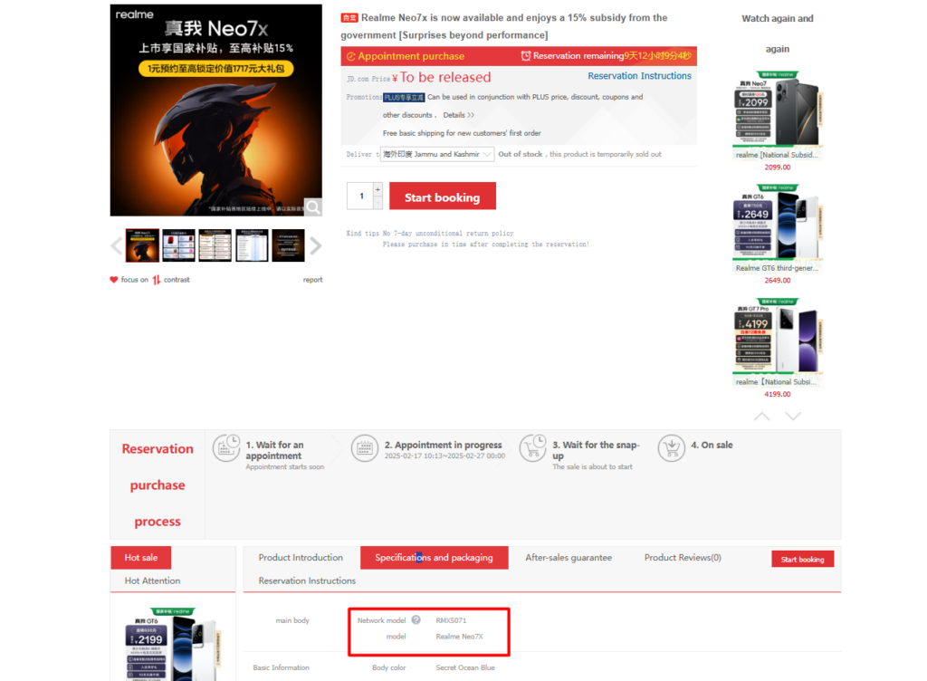 A new Realme smartphone, the Neo 7x 5G, has been listed for pre-orders on JD.com. The listing confirms its model number as RMX5071, which was recently spotted on TENAA. With Realme set to unveil the Neo 7 SE later this month in China, there is speculation that the Neo 7x may debut alongside it. Additionally, it appears that the 7x could be rebranded as the Realme 14 5G for the global market.