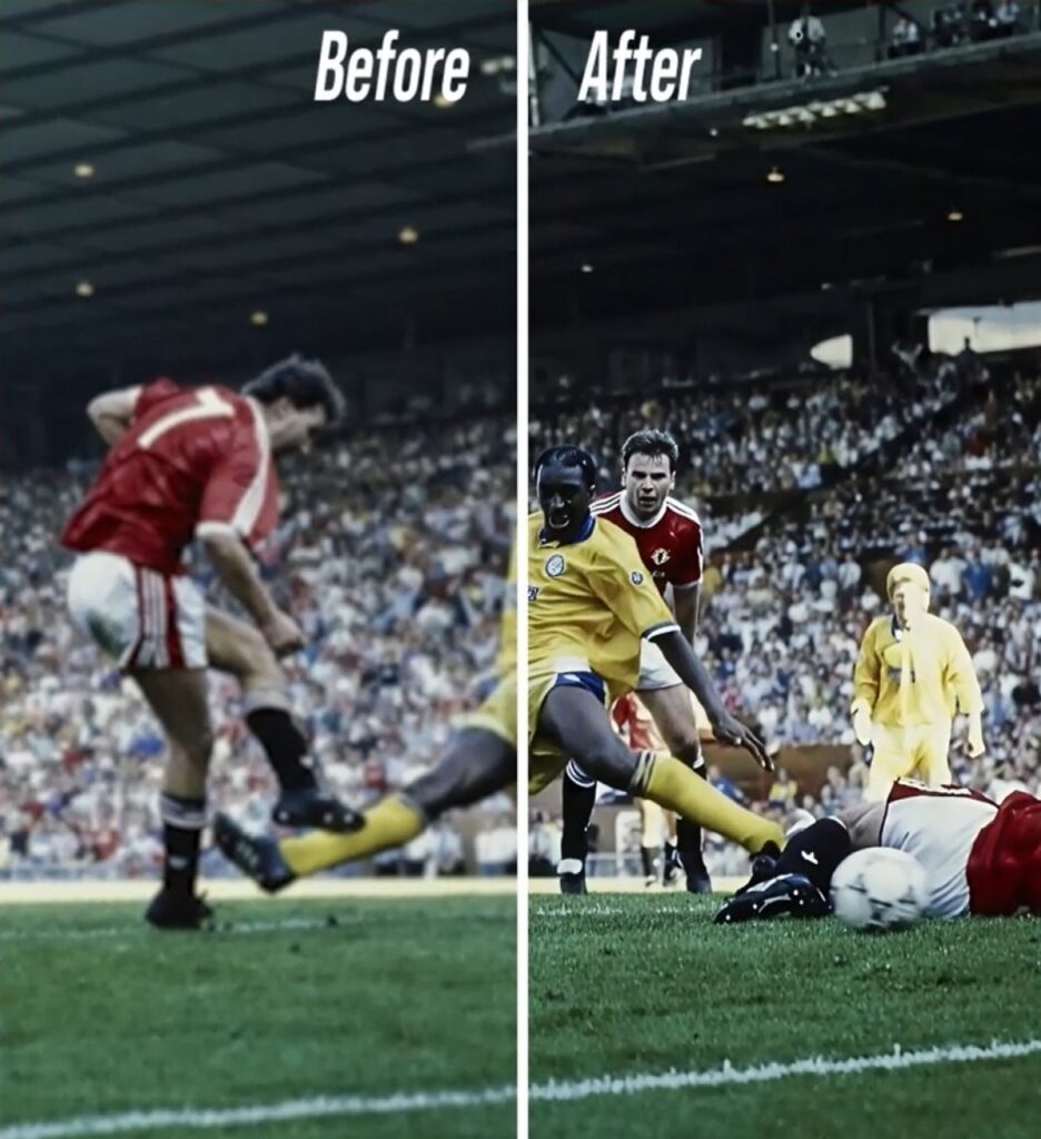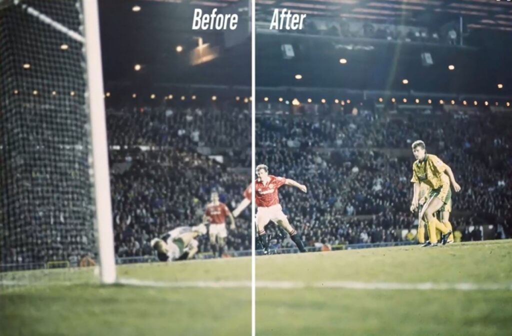 The demonstration featured before-and-after comparisons of iconic Manchester United photos including Mark Hughes’ legendary goal against Norwich City during the club’s first Premier League-winning season. Jason Leach, the club’s historian, shared personal memories tied to these images, pointing out details like construction beams and cranes that were once obscured but are now clearly visible thanks to AI upscaling.