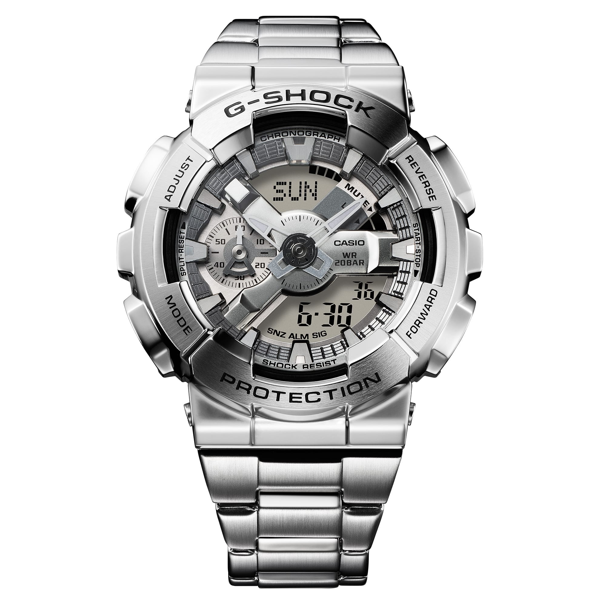 The GM-110D series features a stainless steel bezel that undergoes forging, cutting, and polishing to create an intricate, uneven surface. This design enhances both its durability and visual appeal. The bezel is paired with a glass-fiber-reinforced resin case, which helps absorb shocks while keeping the watch lightweight.