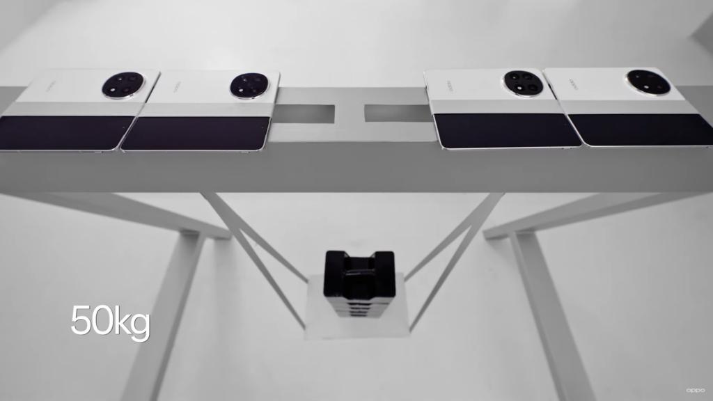 The video showcased four unfolded Find N5 devices supporting a dangling weight of 50 kg, which highlights the slim hinge’s exceptional strength and durability. However, it’s important to note that the test was conducted in a controlled setting. The devices were properly positioned to maximize their load-bearing capacity.
