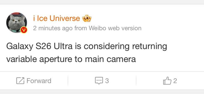 According to prolific leaker Ice Universe, Samsung is considering adding a variable aperture mechanism to the main camera of the S26 Ultra. For those unfamiliar, it adjusts the light intake based on the environment for optimal quality. As a biproduct, it also lets you control the background blur, while the brightness can be managed by adjusting the ISO. So for the users, it is a good thing to have as it adds some flexibility that helps in certain conditions.