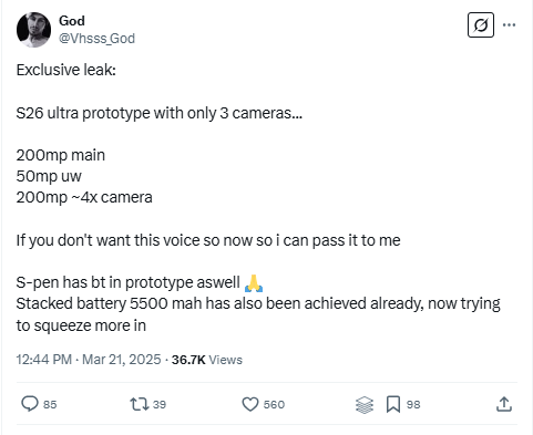 The tipster also claims that the current prototype packs a 5,500mAh stacked battery, an improvement over the 5,000mAh capacity of the S25 Ultra. This year’s model already offers noticeably longer battery life than the S24 Ultra despite having the same capacity, so the S26 Ultra is expected to offer an even bigger jump in battery life.