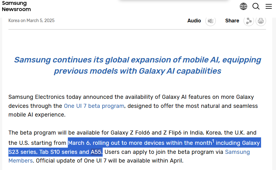 While the Galaxy A55 is yet to receive the beta update, several Galaxy S and Z series devices are also currently stuck with it, and most of them are “expected” to receive the stable update starting in April. Some of them include the Galaxy S24, S23, S22 series, 6th and 5th generation foldables, and the Galaxy Tab S10, S19, and S8 series. According to the company, the stable rollout will begin starting April 7.
