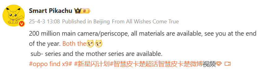 In February, tipster Digital Chat Station claimed that Oppo is considering including a 200-megapixel periscope telephoto camera backed by a large sensor in the Find X9 series. In today’s leak, tipster Smart Pikachu has claimed that the Find X9 series will feature a 200-megapixel main camera or a 200-megapixel periscope telephoto lens. He added that the necessary materials for these components are already available, and the phones are expected to debut by the end of this year.