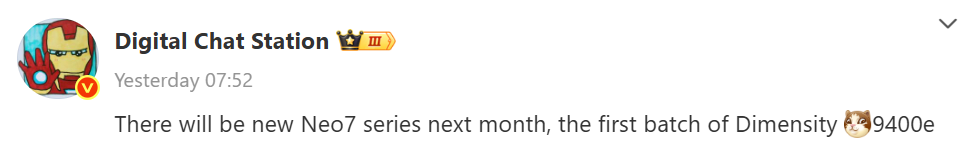 The tipster added that the alleged Neo 7 Pro will feature the upcoming Dimensity 9400e and will debut in May. He did not reveal anything else about the device. In a newer Weibo post, the tipster is seen talking about the OnePlus Ace 5s and Ace 5V coming with Dimensity 9400+ and 9400e chipsets launching in May in China.