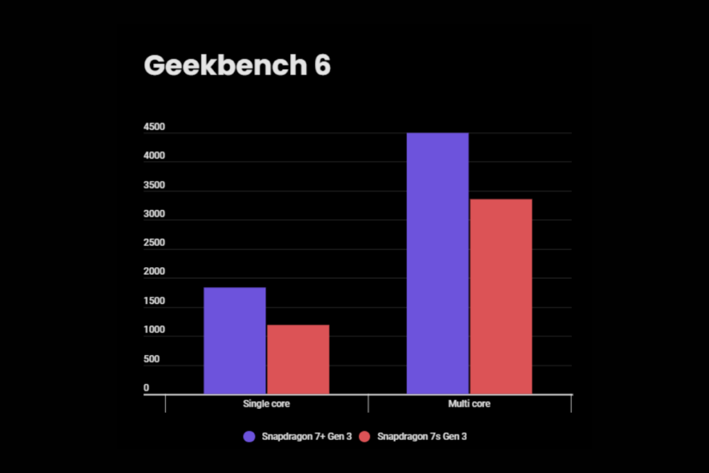 The Snapdragon 7+ Gen 3 also leads comfortably in Geekbench tests. It delivers around 54% higher single-core performance and a 34% boost in multi-core results compared to the Snapdragon 7s Gen 3. This means better speed in everyday tasks and noticeably faster performance in demanding, multi-threaded workloads like gaming or multitasking.