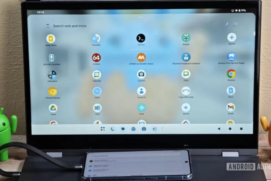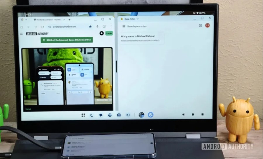 Rahman managed to get the feature running on a Pixel 8 Pro connected to a laptop. The Android desktop interface has a taskbar at the bottom, complete with three-button navigation on the right.