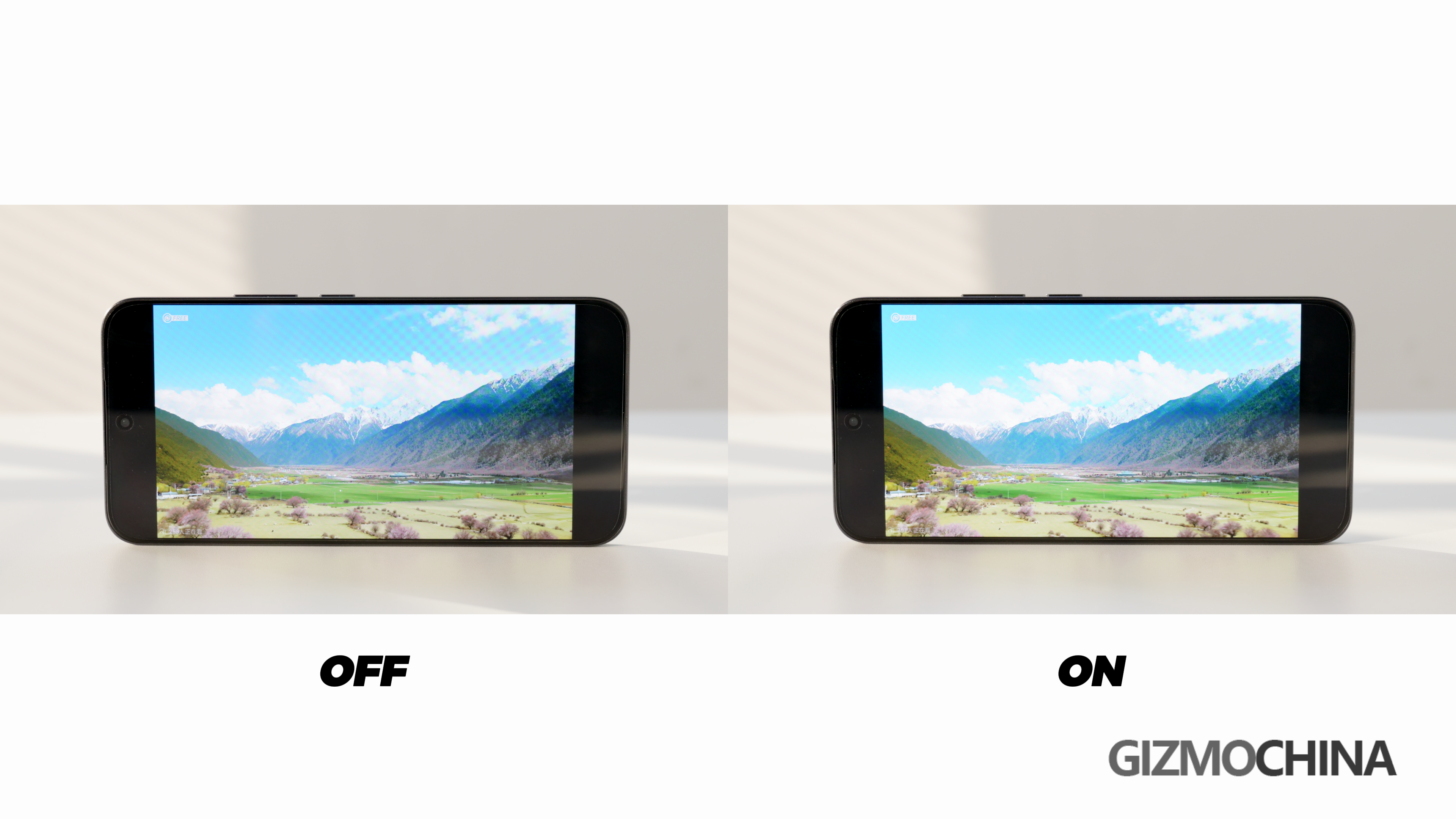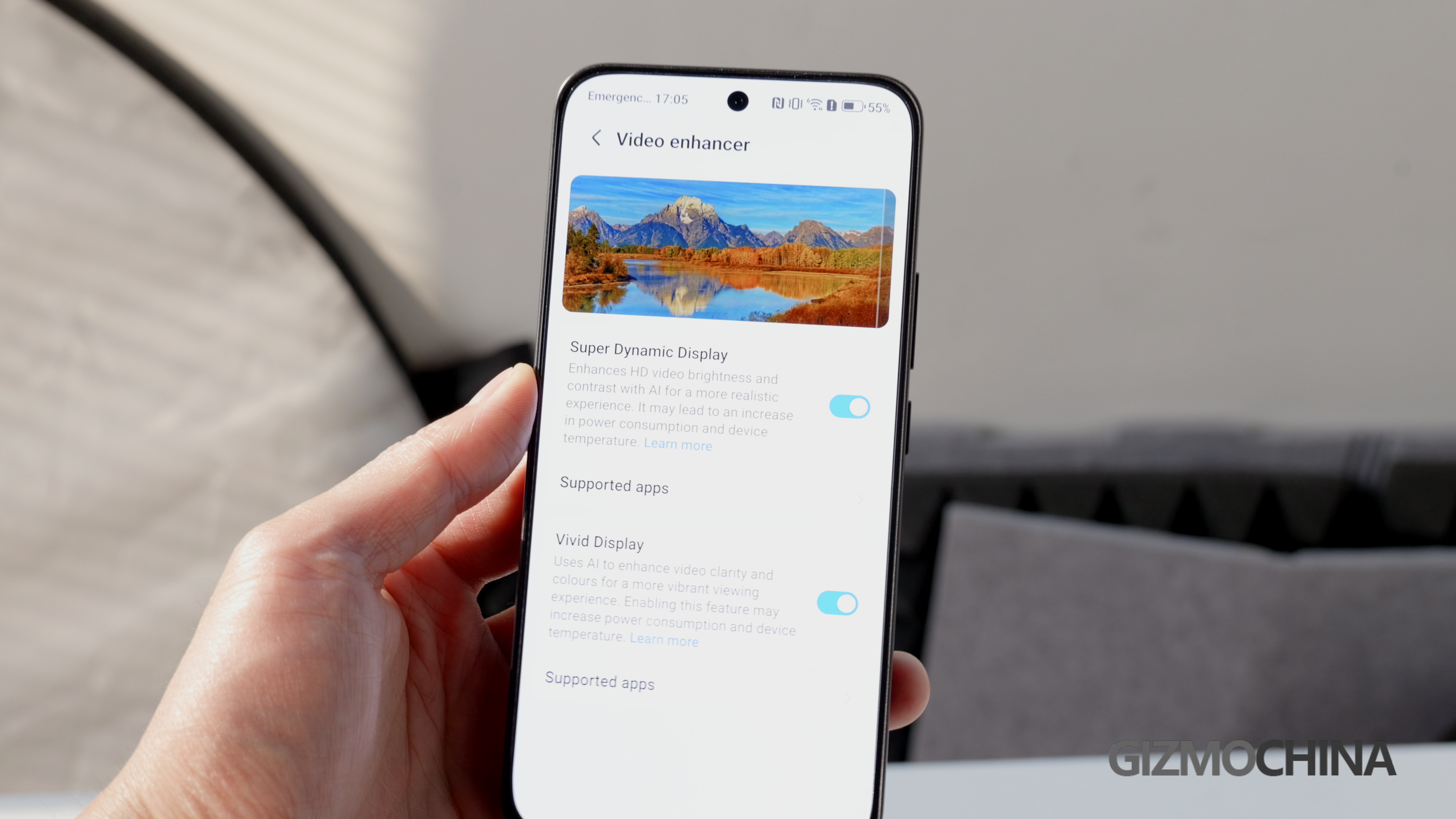 The peak brightness of the screen is 5000 nits, and the refresh rate can be 60Hz or 120Hz, or dynamic. Two things that are very interesting with the screen is the ebook mode, and video enhancer. In the ebook mode, your phone will turn into a gray screen, so if you want to read books, or you are tired of vivid colors and pictures, this mode can be very useful. There are two choices in the video enhancer, the super dynamic display and the vivid display. These two options will significantly make the videos brighter and more contrasty, and the experience is a lot better, and I am sure you can spot the difference here.