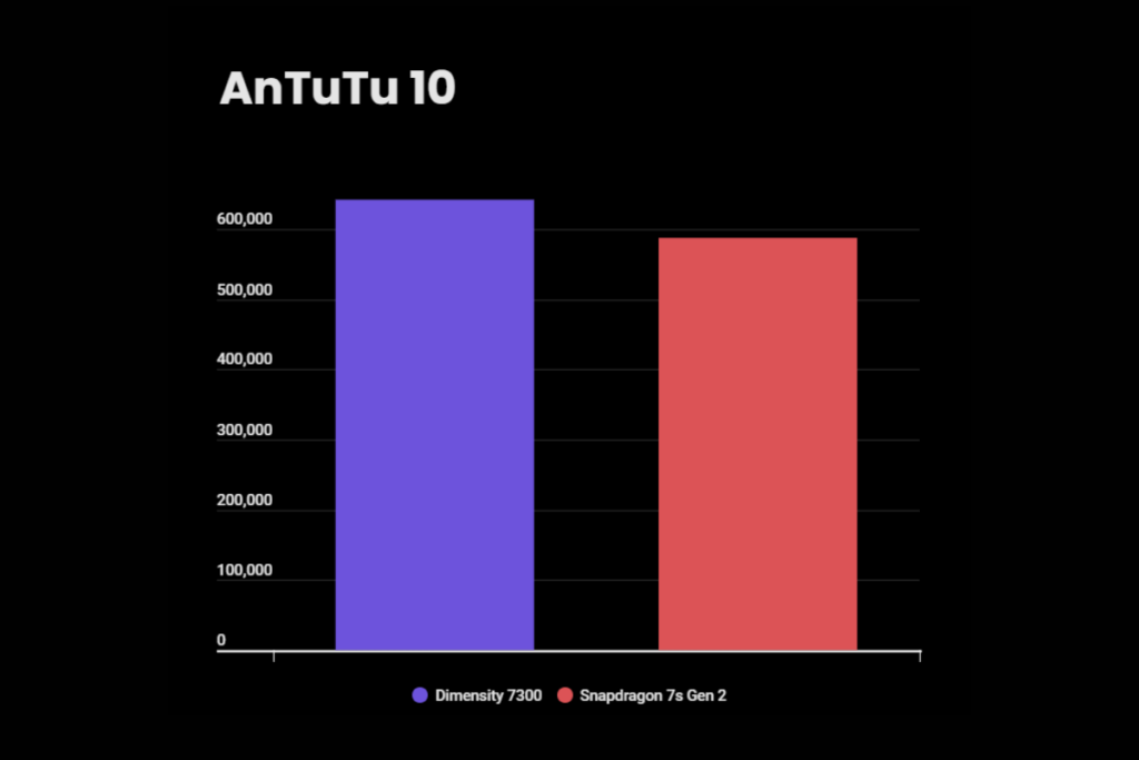 The Dimensity 7300 outperforms the Snapdragon 7s Gen 2 in overall AnTuTu score, racking up 641,755 points compared to 587,323. This reflects a solid leap in overall performance.