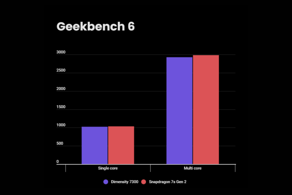 In Geekbench tests, the Snapdragon 7s Gen 2 takes a slight lead over the Dimensity 7300, scoring 1,034 in single-core and 2,982 in multi-core performance, compared to 1,023 and 2,926, respectively. So, both chips offer similar CPU capabilities, making them evenly matched in everyday tasks like web browsing, app launching, and multitasking.