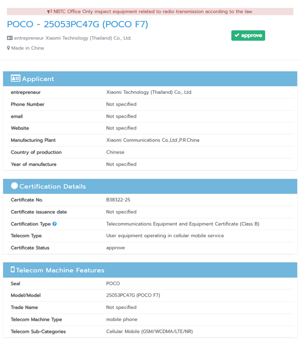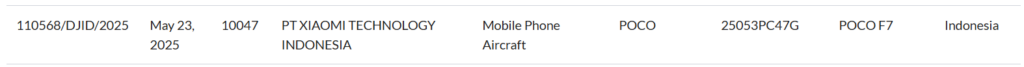 The Poco F7 has been listed on Thailand’s NBTC database under the model number 25053PC47G, confirming support for 5G connectivity. Simultaneously, it has been approved by the SDPPI certification authority in Indonesia. These regulatory green lights clear the path for the phone’s launch in both Southeast Asian markets.