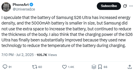 Charging speeds are also reportedly getting a significant bump. @UniverseIce suggests Samsung is introducing upgraded thermal management, possibly raising the charging speed to 65W—up from 45W on the S25 Ultra. If true, that could mean a significant reduction in the downtime.