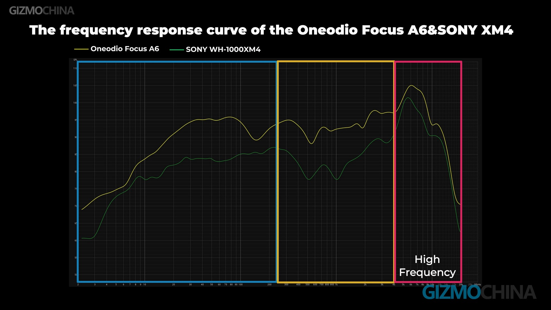 We also compared it with the SONY WH-1000XM4. The Oneodio Focus A6 is no less impressive than the XM4 in real-world listening in the lows, mids, and highs. The A6 has a stronger low-frequency response. Here it also matches my hearing experience on these two, as the XM4 headphones are less emphasizing bass. In the mid-frequency range, the A6’s curve is more stable than the XM4’s lower response. Considering mid-frequencies are crucial for vocals and instruments, the A6 likely offers more natural and clear vocals, while the XM4 may need a boost in this range. Similarly, the A6’s high-frequency response surpasses the XM4’s.