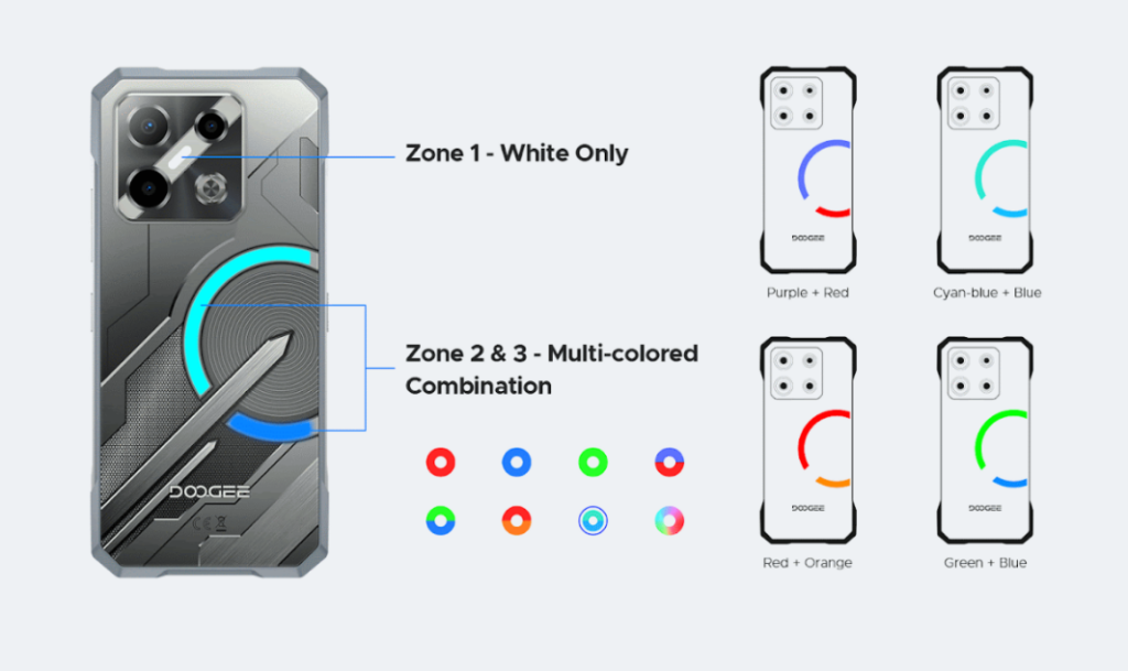 The Blade GT and Blade GT Ultra feature a clean, futuristic design with sleek white lighting known as the “Lighting Elf” system. This offers a refined and minimalistic aesthetic for users who prefer subtle illumination. On the other hand, the Blade GT Play and GT Pro step up the game with DOOGEE’s latest Cyber Aura Lighting 2.0 system.
