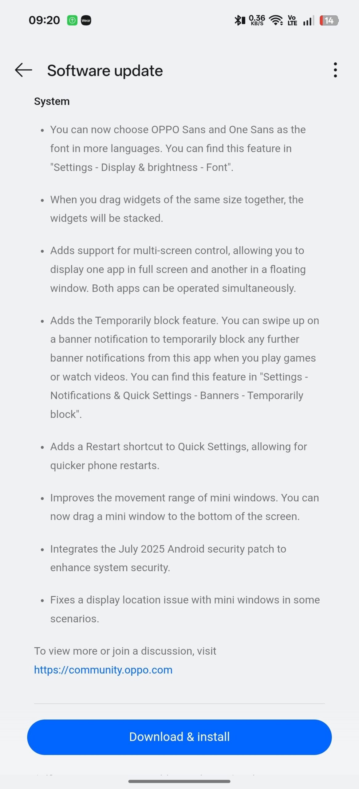 System-wide changes include the ability to choose between OPPO Sans and One Sans fonts in more languages. Widgets of the same size can now be stacked. Multi-screen control allows one app to run in full screen and another in a floating window at the same time. A new option to temporarily block banner notifications while gaming or watching videos has been added.