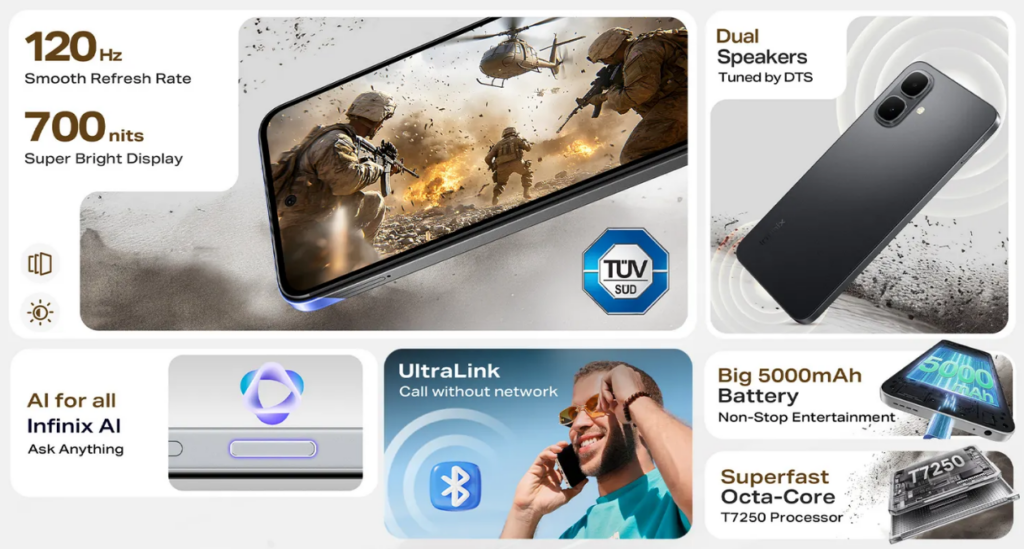 The Infinix Smart 10’s microsite reveals that it has a 120Hz LCD panel with a punch-hole design and support for up to 700 nits of brightness. For audiophiles, the device is equipped with a 3.5mm audio jack and a dual speaker setup tuned by DTS. For security, it features a side-facing fingerprint sensor.