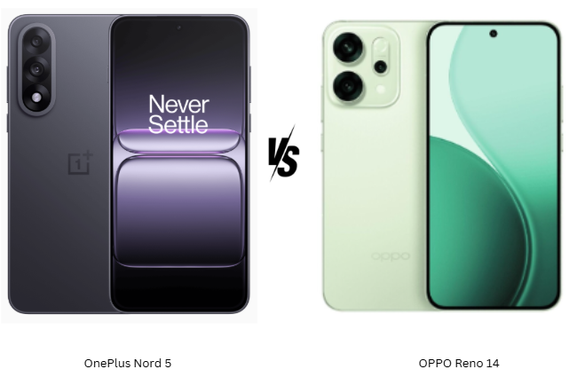 With the OnePlus Nord 5 and OPPO Reno 14 both stepping into the upper mid-range segment with flagship-grade features, choosing between them isn’t easy. This comparison matters because both phones bring powerful chipsets, high-end displays, and 50MP cameras, yet they take very different approaches in design, performance, and value. If you’re torn between speed and style or camera and battery, this face-off will help clarify which suits your priorities better.