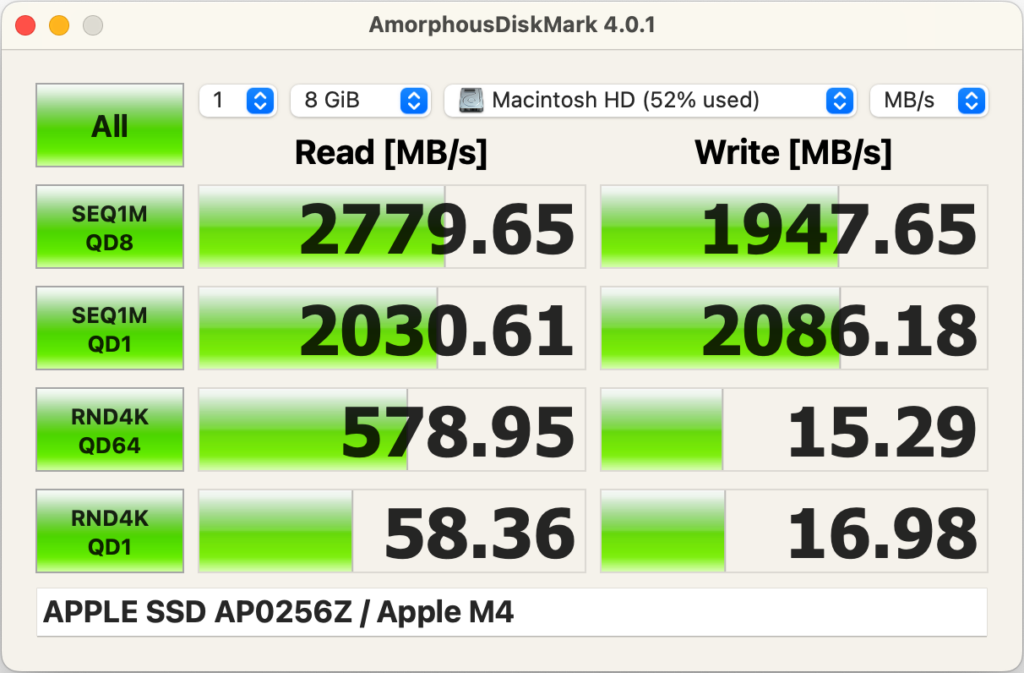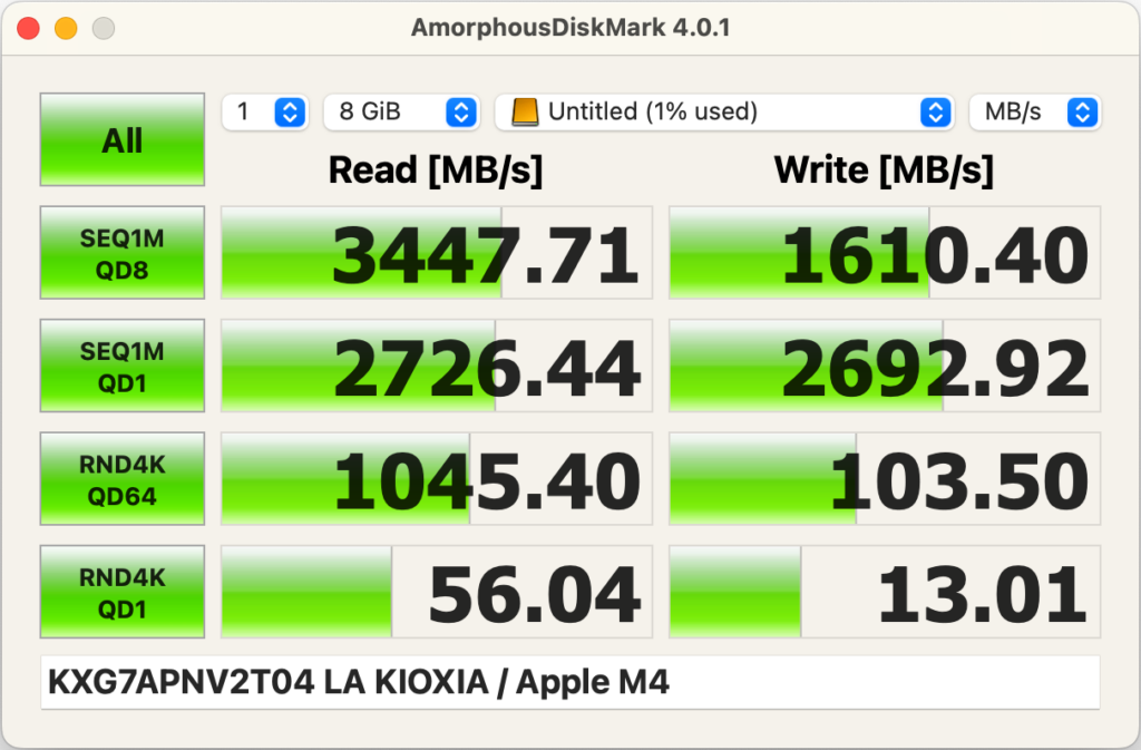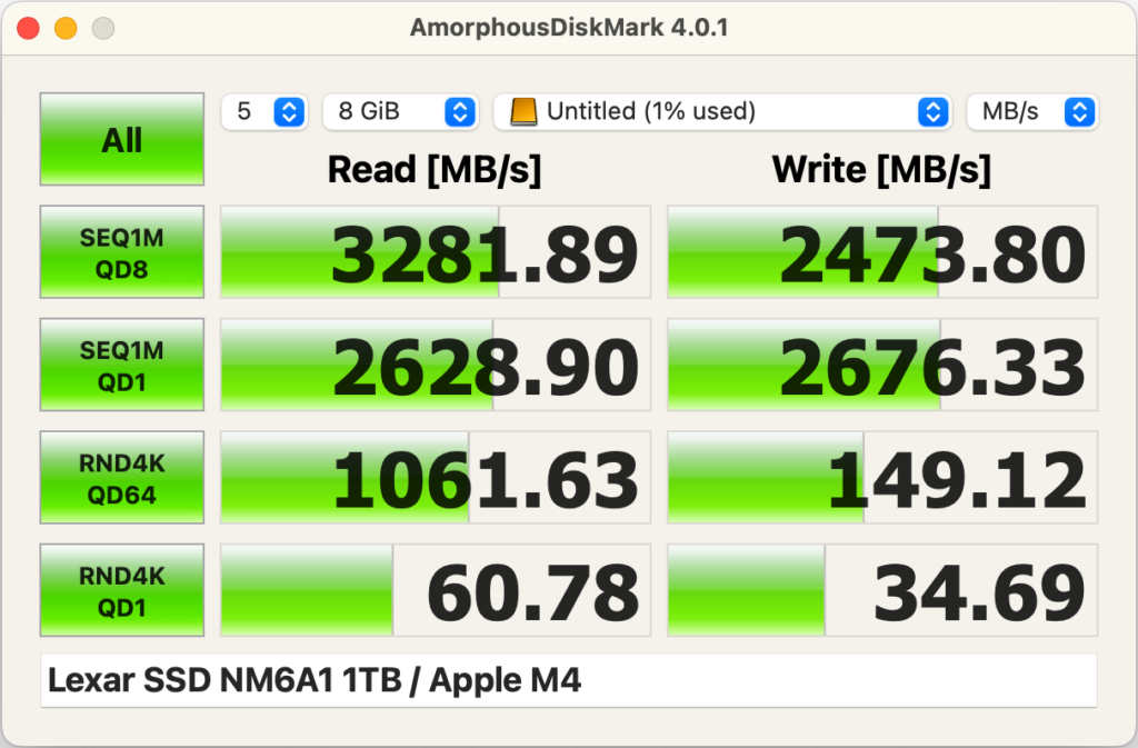 First, we ran a simple test using AmorphousDiskMark on a MacBook Air. The TERRAMASTER easily hit the package claim of 3200MB/s read and write. Read speeds even reached 3400MB/s. When switching to a Gen3 SSD, both read and write speeds dropped a bit. The same trend was seen in the BlackMagic Disk Speed Test. What’s more interesting is that TERRAMASTER is using both Gen3 SSD and Gen4 SSD. It performs faster than the built-in SSD.