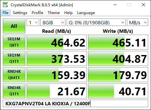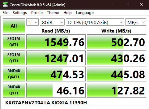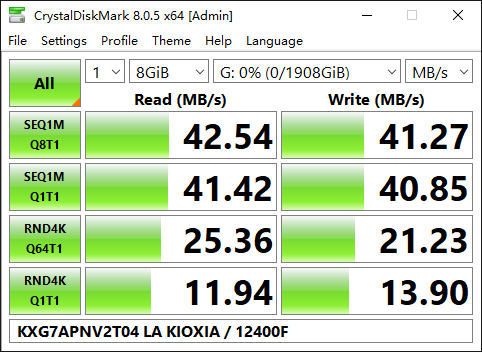 Finally, we tested it again on a USB 3.2 Gen2×2 interface, which has very poor compatibility. Luckily, it was recognized correctly. But once we ran the test, we realized that it was far from performing at 20Gbps. Write speeds were even about the same as the 5Gbps interface.