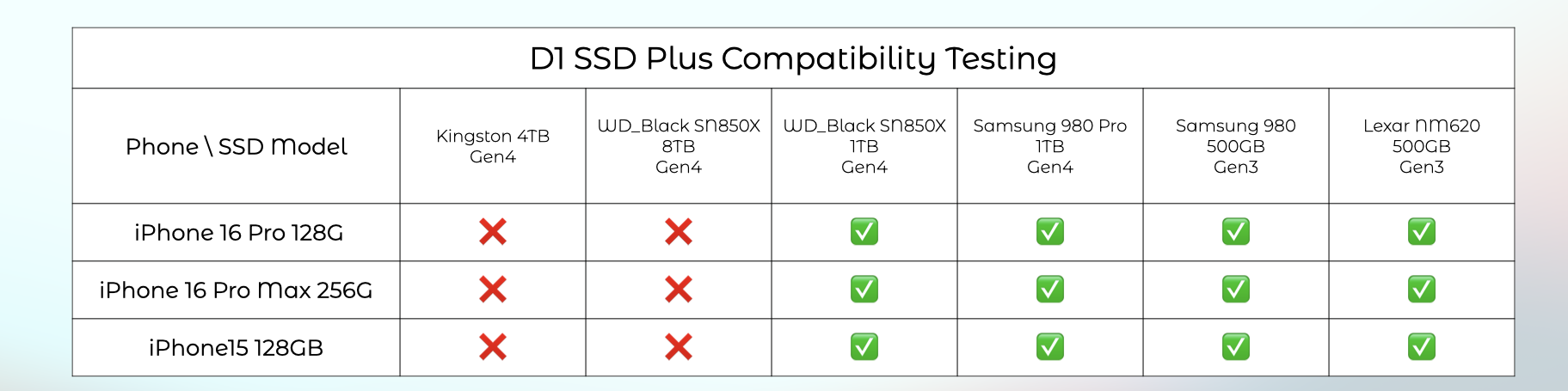 Or you can check out the compatibility with tested SSD models here. The D1 Plus has good compatibility with most latest SSD models, while only a couple of models with high power inputs may not be supported.
