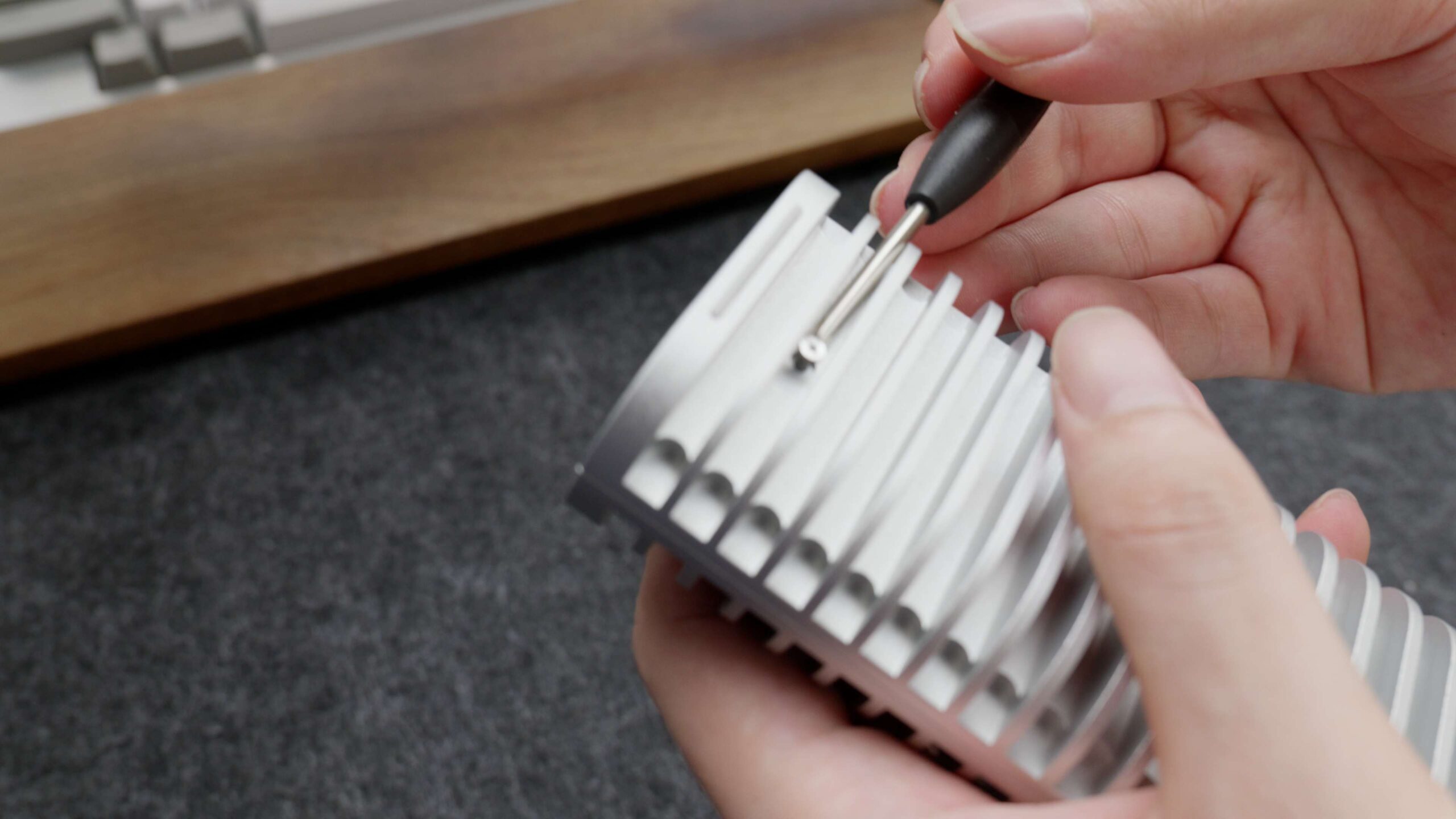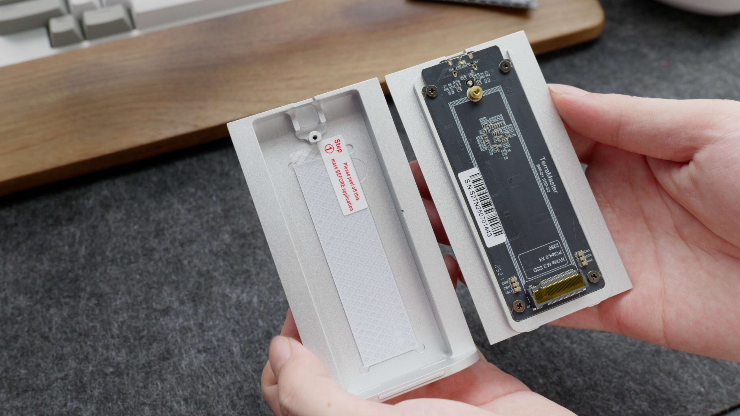I’ll call the side with the feet the back side. Unscrewing this screw on the back allows us to open the SSD case. You don’t have to worry about losing this screw either, TERRAMASTER has made a limit for it. After unscrewing it, it still snaps onto the screw hole, so it won’t be easily lost. The left side of the case already has pre-installed thermal pads on it, so the thinner one that was just there, I think, is supposed to serve as padding for other thinner SSDs.