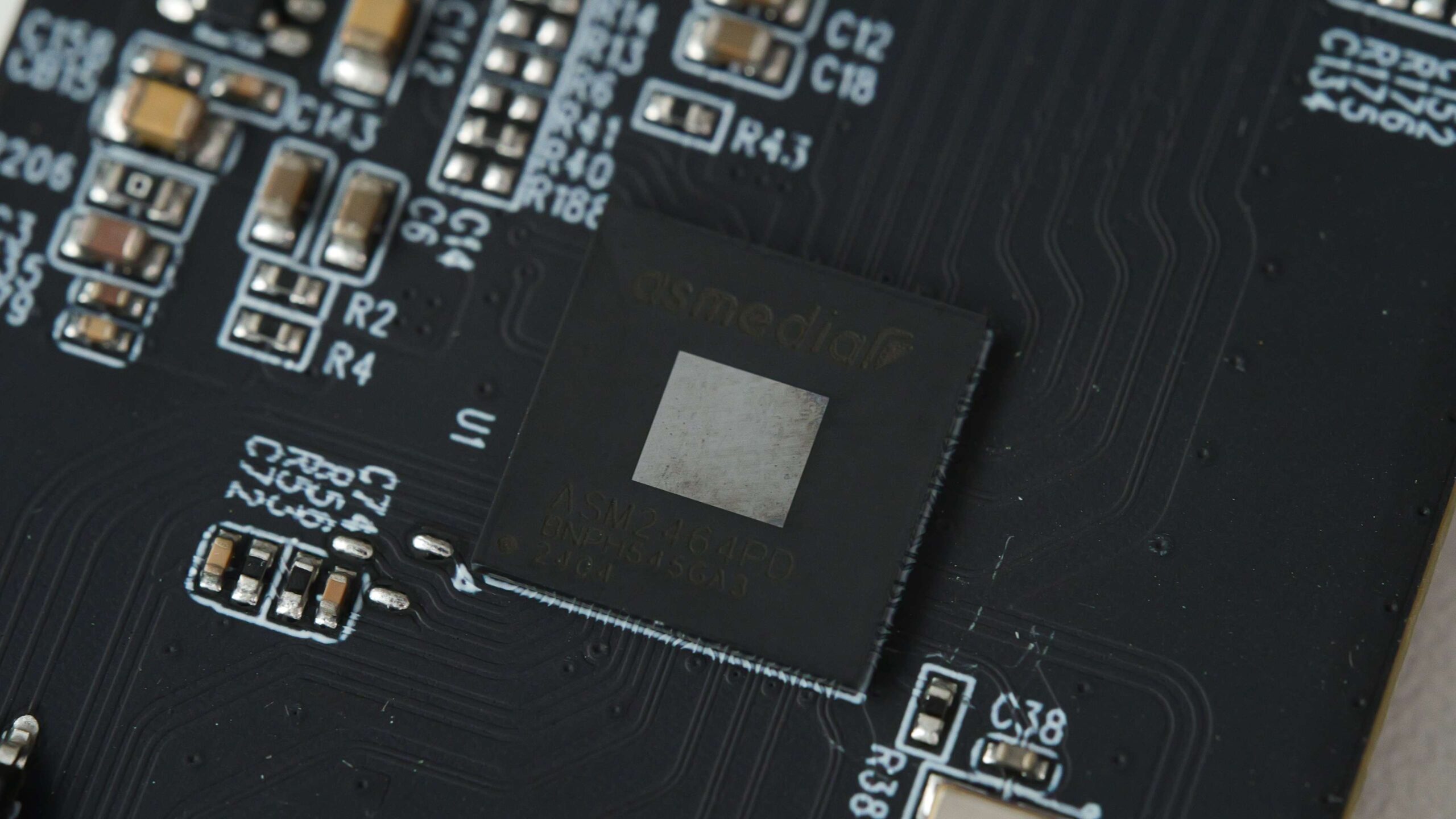 The chip underneath the capacitor is an old acquaintance. The ASM2464PD is the same chip we used to add a NIC to the Mac earlier, and it’s capable of delivering transfer speeds of up to USB4/Thunderbolt 20Gbps x2, and is compatible with existing USB 3.2 ports and Thunderbolt 3.