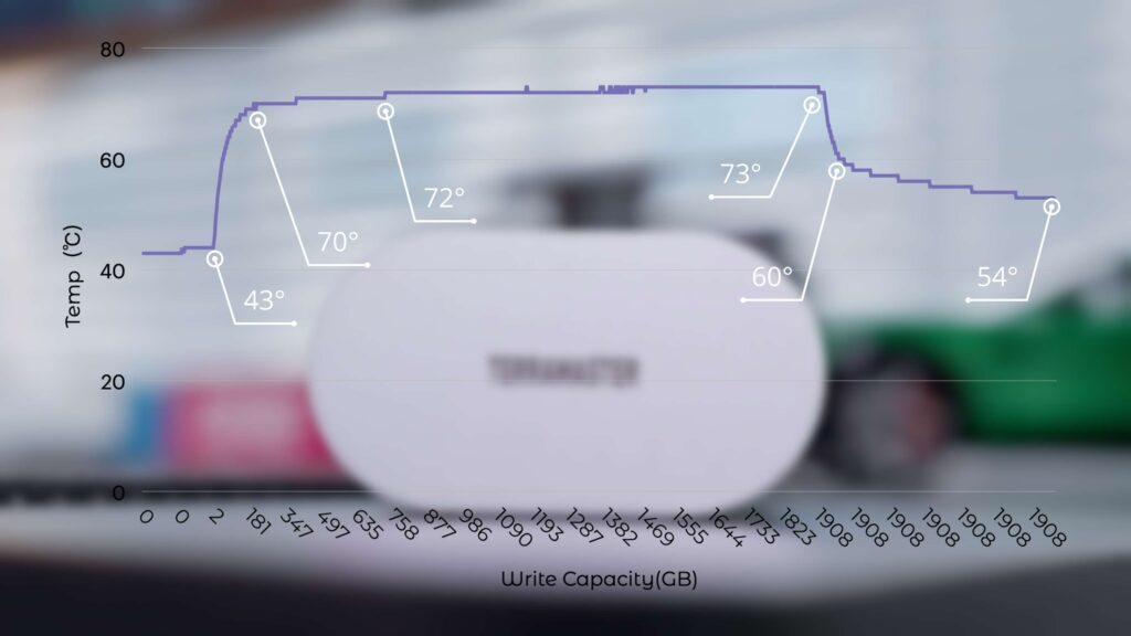 At the beginning of the test, as the amount of writes increases, the temperature rises rapidly, which shows that TERRAMASTER needs time to adapt and dissipate heat effectively in the initial stage; in the middle of the test, the temperature stabilizes, and TERRAMSTER has already reached the optimal working condition and can control the temperature consistently and effectively; and in the late stage of the test, as the amount of writes decreases, the temperature begins to drop gradually. This reflects the TERRAMSTER’s ability to maintain efficient heat dissipation after a long period of time, ensuring that the SSD cools down safely at the end of a write operation.