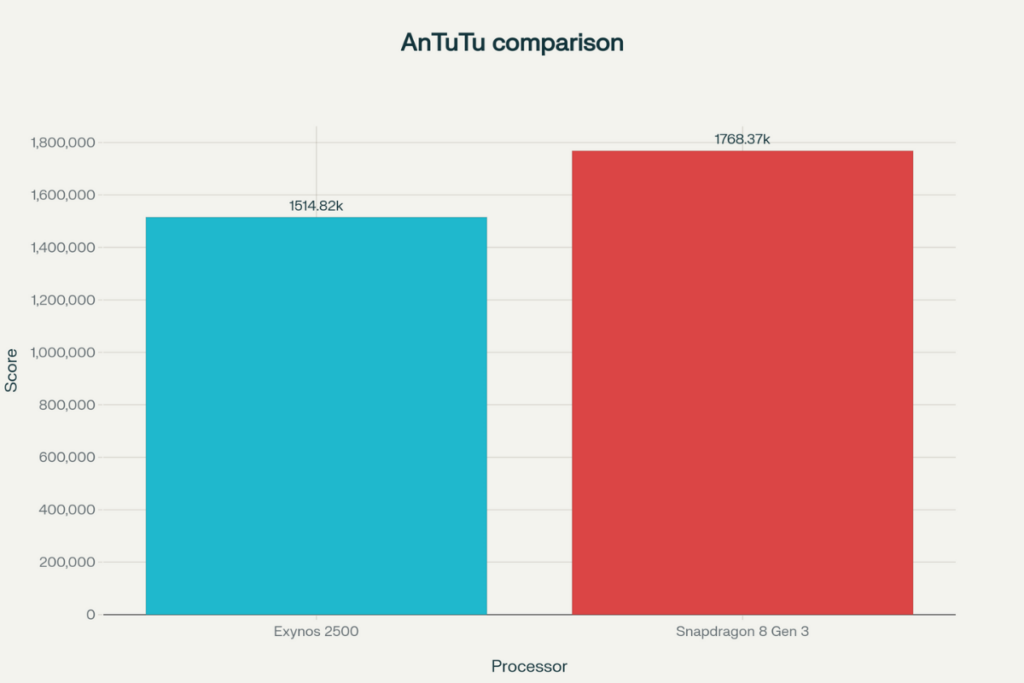 The Snapdragon 8 Gen 3 outperforms the Exynos 2500 on AnTuTu with a score of 1,768,372 vs 1,514,821, showing about a 17% overall performance lead. It leads across all key areas — CPU is 16% higher, while GPU performance is 23% better, which directly benefits gaming and graphics-heavy tasks. Memory and UX scores are also slightly in Qualcomm’s favor.
