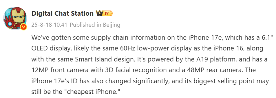 Based on the information obtained from the supply chain, DCS claimed that the iPhone 17e will be equipped with a 6.1-inch OLED display, most likely the same 60Hz low-power panel used on the iPhone 16. It will reportedly carry the same Dynamic Island design and be powered by the Apple A19 chipset.