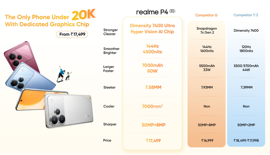 Realme will also debut the P4 Pro 5G at the same event. Unlike the standard P4, the Pro variant will use the Snapdragon 7 Gen 4 processor and offer a 144Hz HDR10+ display with a much higher 6,500 nits peak brightness. It will also share the same 7,000mAh battery with 80W charging.