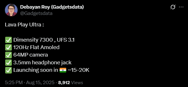 According to tipster @Gadgetsdata, the Lava Play Ultra 5G will run on the MediaTek Dimensity 7300 chipset. It is expected to feature UFS 3.1 storage for faster performance. The phone is also tipped to come with a 120Hz flat AMOLED display. On the camera side, it is said to include a 64MP main sensor on the back. The device may also keep the 3.5mm headphone jack, which is useful for wired gaming headsets.