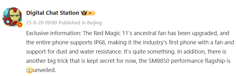 According to the tipster, the upcoming Red Magic 11 will feature an upgraded cooling fan. Therefore, it will be the first time in the industry that a smartphone with a built-in fan also carries an IP68 rating for dust and water resistance.